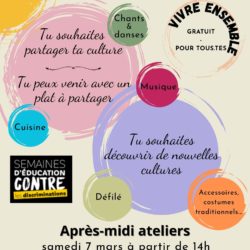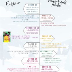 Pendant les vacances de février, le secteur familles vous propose un programme d’animations pour les parents-enfants / grands parents-enfants et adultes : • Chants, danse et percussions corporelles • Party crêpes • Jeux traditionnels du monde • Création de kawaii en feutrine • Atelier floral « Bulbes printaniers » • Tai Chi • Calligraphie chinoise Read more about Programme des vacances de février au SECTEUR FAMILLES[…]