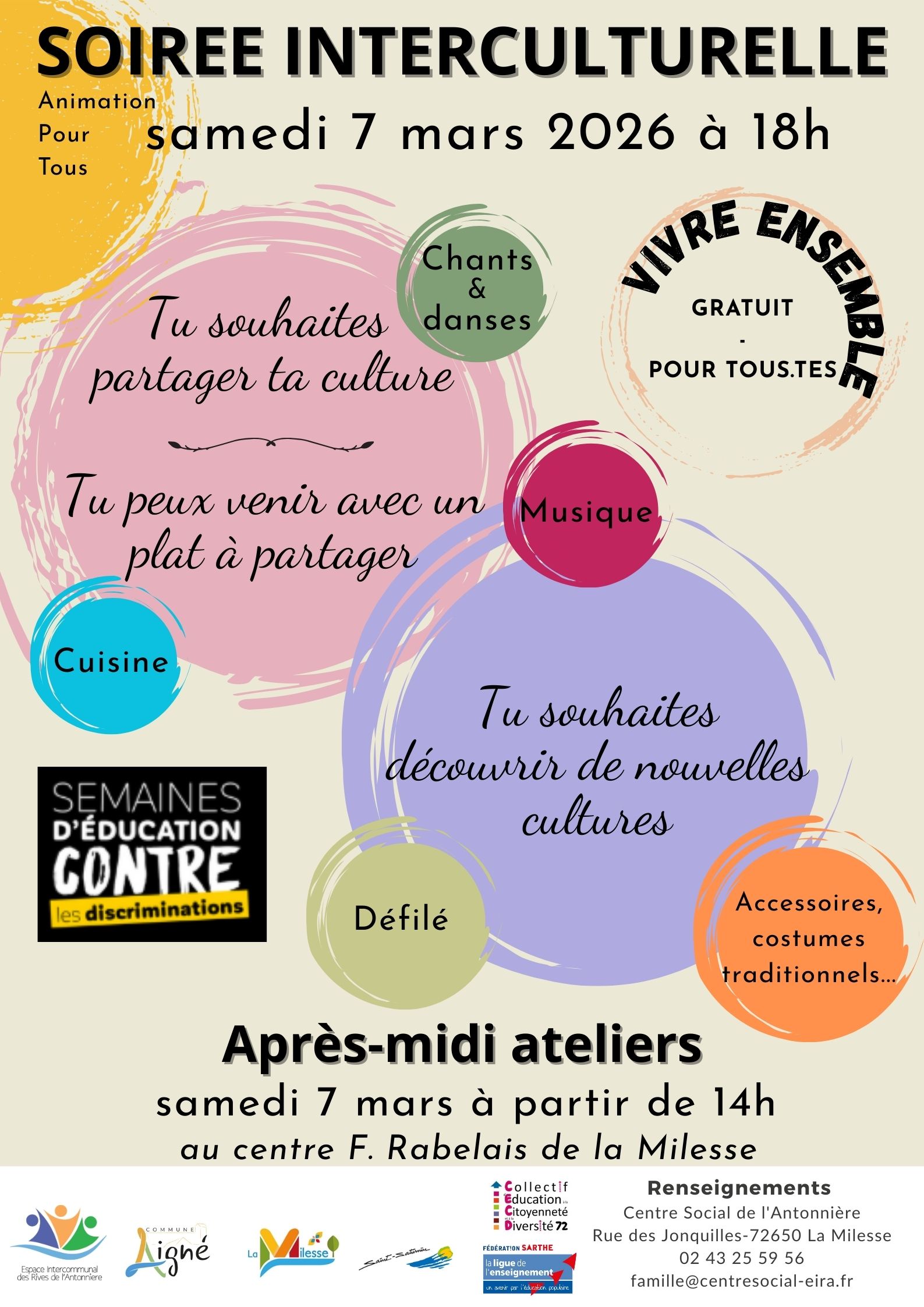Envie de partager ta culture ou de découvrir celles des autres ? Rendez-vous à la soirée interculturelle organisée par le centre social de l’Antonnière dans le cadre des Semaines d’Éducation Contre les Discriminations. Samedi 7 mars 2026 à partir de 18h – Au Centre F. Rabelais de la Milesse – Gratuit et ouvert à toutes Read more about SOIRÉE INTERCULTURELLE – VIVRE ENSEMBLE[…]