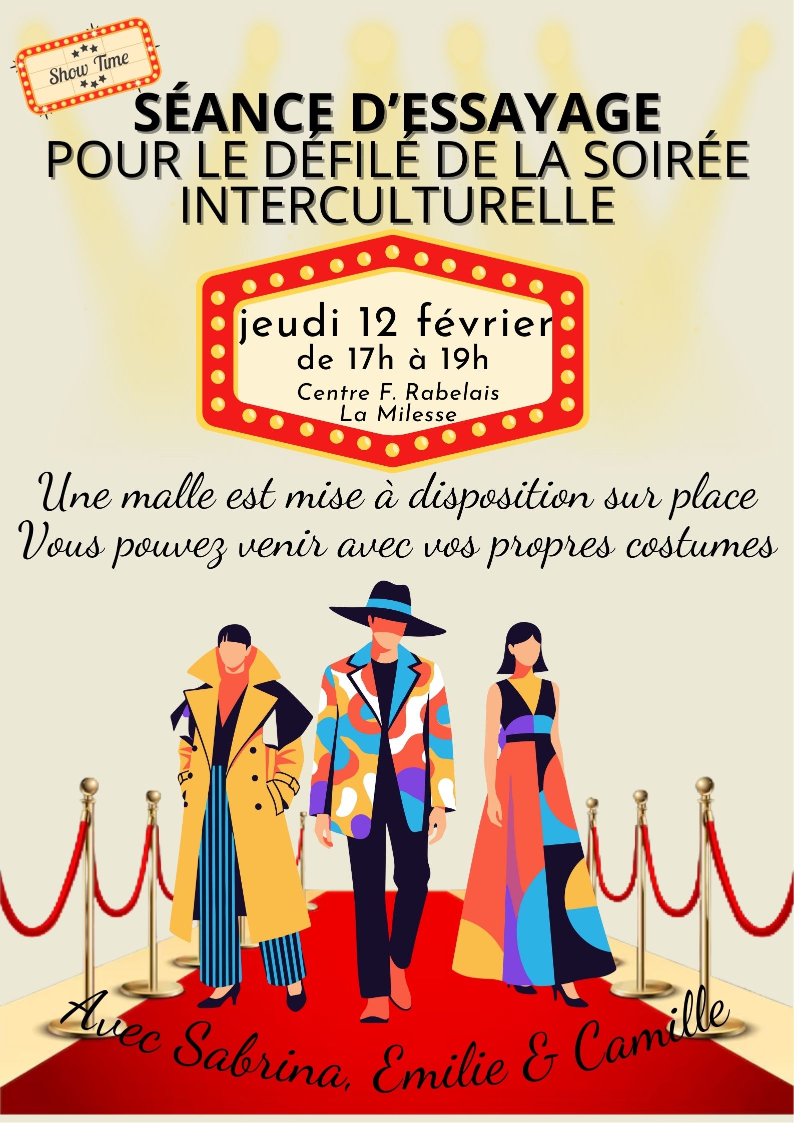 Pour préparer le défilé de la soirée interculturelle du 7 mars, tu peux venir à la séance d’essayage de costumes le jeudi 12 février de 17h à 19h au Centre F. Rabelais de la Milesse. Une malle de costumes sera disponible sur place (tu peux aussi venir avec tes propres tenues). Infos & inscriptions : Read more about SOIRÉE INTERCULTURELLE – DEFILE en costumes traditionnels[…]